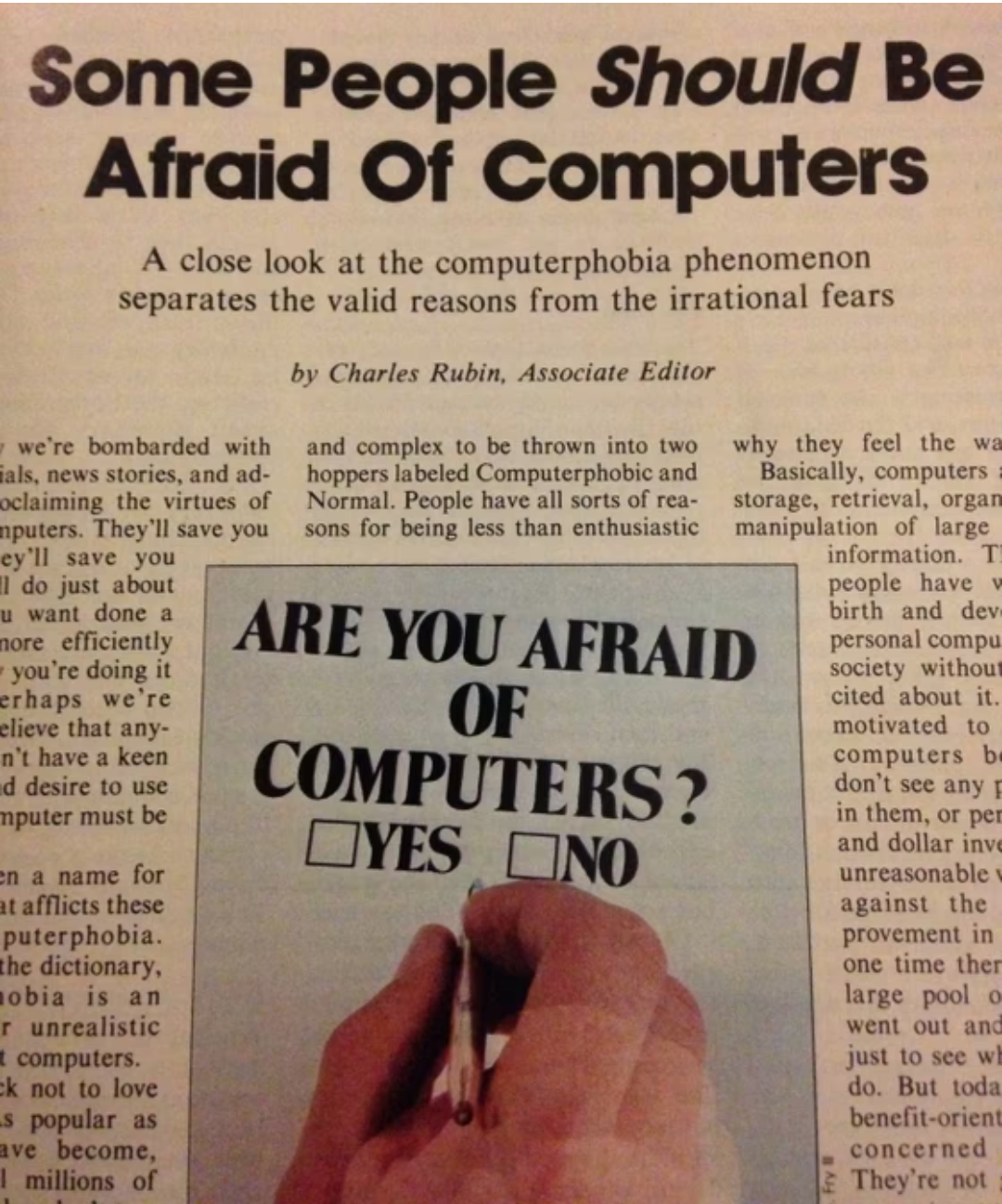В 1980-е персональные компьютеры начали появляться в офисах и домах, вызвав у многих волну тревоги. Психологи даже ввели понятие «компьютерофобия» — страх перед компьютером. В 1983 году журнал Personal Computing описывал целый букет симптомов: от боязни нажимать лишнюю клавишу до чувства собственной беспомощности и страха быть замененным умной автоматикой. В прессе тех лет выходили советы, как преодолеть этот иррациональный страх. Психологи успокаивали, что страх перед незнакомой техникой — естественная реакция, и советовали «дать компьютеру шанс, поучиться, привыкнуть и помнить, что командуете вы, а не машина».