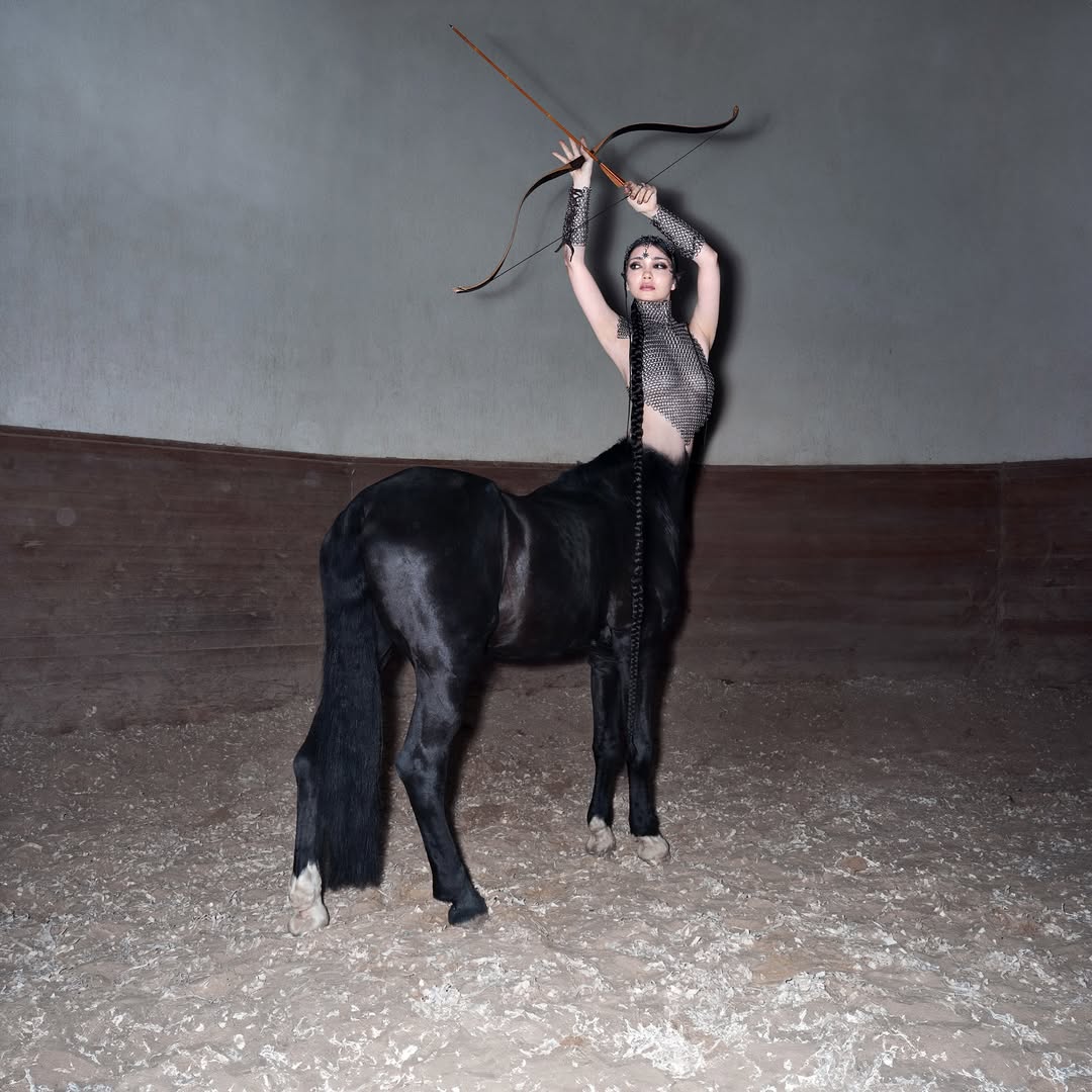 Инсталляция собрана из предметов, отсылающих к мифу и кочевой культуре: наконечники стрел, гребни из рога, кнут из волос, древние таби и кольцо для стрельбы из лука. Боевое украшение было создано в коллаборации с казахстанским брендом Yelai.