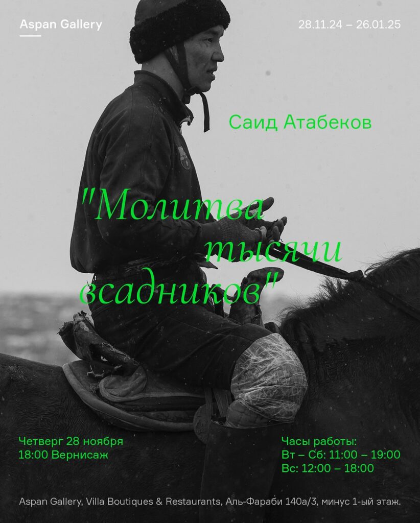 В Aspan Gallery продлили персональную выставку «Молитва тысячи всадников» Саида Атабекова. Экспозиция сконцентрирована вокруг образа кокпариста — профессии, наблюдению за которой художник посвятил 15 лет. На выставке представлены две серии, включающие 14 фотографий из архива более чем 1500 снимков, сделанных им во время игр кокпар.