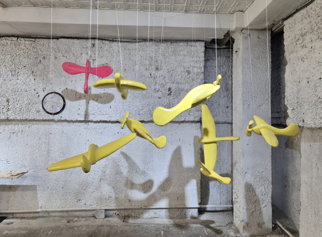 И всё же инсталляцию Асхата Ахмедьярова можно определить как доминанту. Художник представил инсталляцию из парящих в воздухе самолётиков. Интересно, что  расположены они не под потолком, а примерно на уровне глаз зрителя.