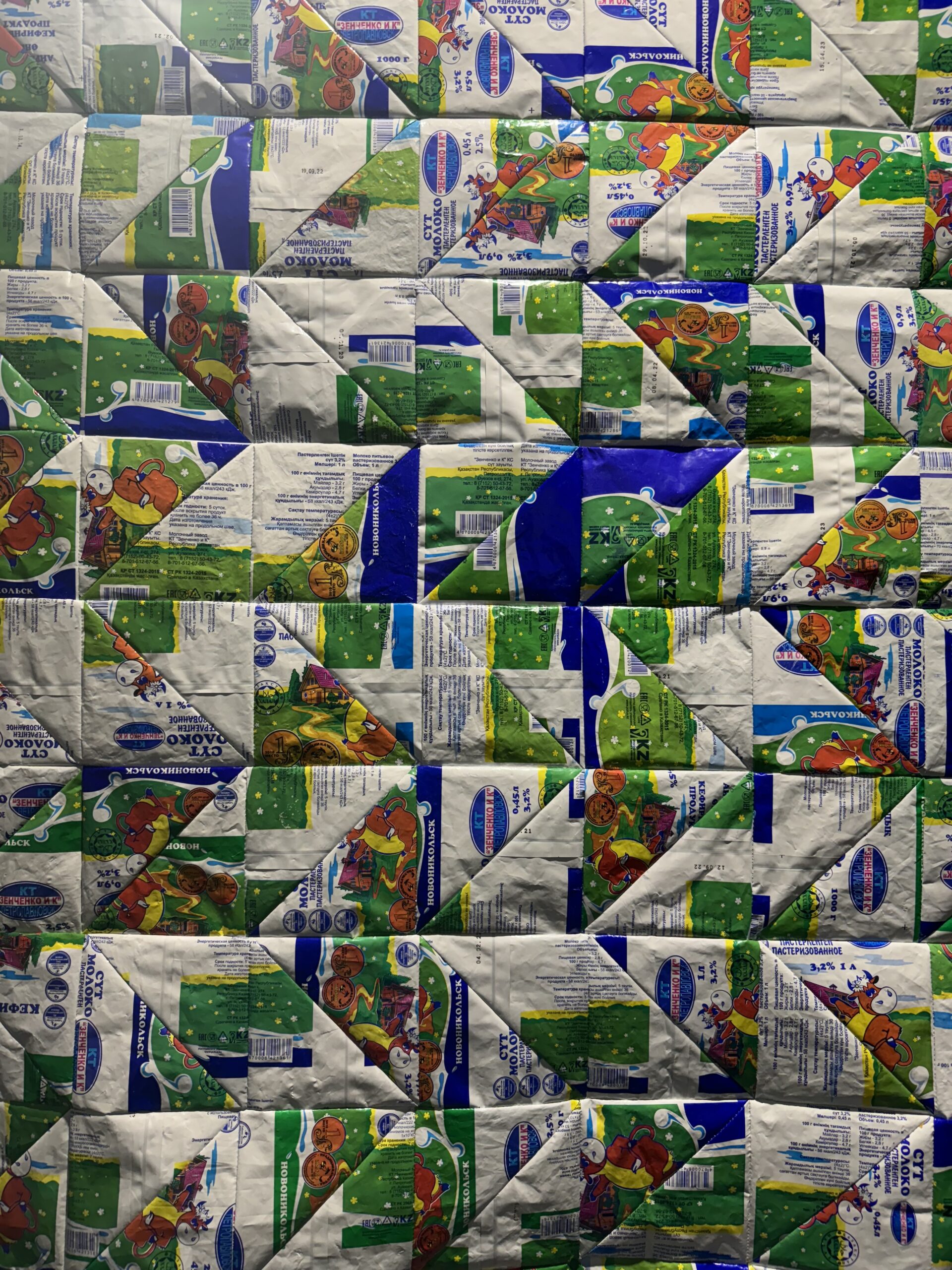 Тему «срез времени» в другом ключе рассматривает Алина Арыстанбаева. В работе «Milk Memories» (2023 г.) художница отдаёт дань семейным традициям. Её восхищает, что бабушка использовала пустые вымытые пакеты из-под молока для различных бытовых целей.