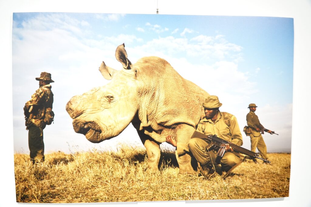 Последнего на Земле самца северного белого носорога звали Судан. Огромная голова Судана, расположенная под углом в центре, наклонена низко и повернута влево. Его конечности утопают в траве кенийской саванны. Лесничие, защищавшие его, выстроились вокруг на фотографии, словно живой щит, оберегающий его от браконьеров. Ошибочная вера человечества в целебные свойства рогов носорога привела к тому, что Судан оказался единственным в своём роде. Эта фотография рассказывает историю о преданности и хрупкости величественных существ нашей планеты — это история трагедии, стойкости и надежды.