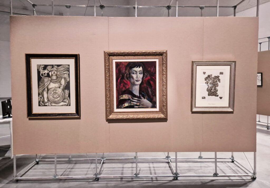 Фото экспозиции. Слева: работы Сауле Сулейменовой, справа: работы Куаныша Базаргалиева.