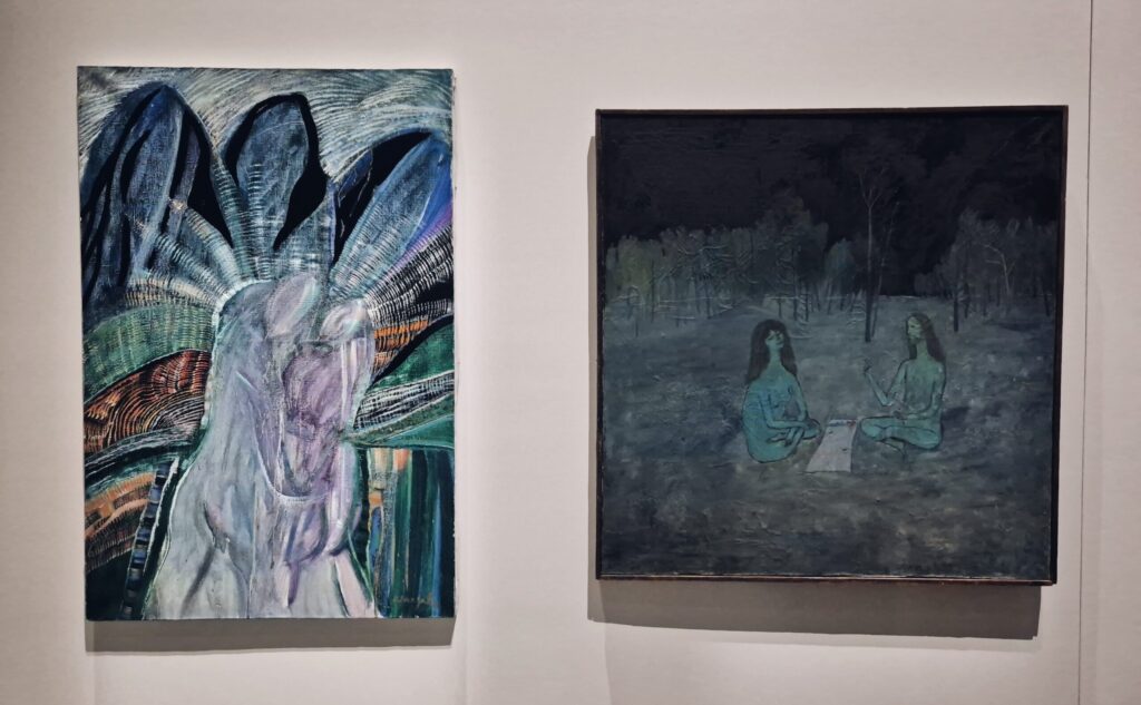Удивительным живописным диалогом раскрываются полотна Сергея Маслова и Алмагуль Менлибаевой. Ранние работы художницы сопоставлены со зрелыми работами мастера, большинство из них периода 1990-х годов. Дуэт их живописи — сплошное эстетическое наслаждение: взгляд скользит по ритмам, следует линиям, пугается неожиданных образов, замирает в густом пространстве холста, исследует сложную голубую фактуру, радуется и влюбляется.