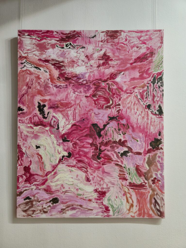 Творчество Меруерт Кунаковой отличается разнообразием медиумов, в каждом художница по-своему интересна. Но в новой экспозиции обращает на себя внимание висящая отдельно живопись. Она выделяется тем, что является чистой живописной абстракцией, где все тонкие намёки на фигуративность разбиваются о соседние пастозные мазки. В этой работе изменилась живописная техника Кунаковой, если сравнивать с прошлой персональной выставке. В новой одинокой, но самодостаточной работе мы видим, что ушла некая неловкость, художница отдала предпочтение жирному удару путешествующей по холсту кисти, нежели многочисленным полупрозрачным подтёкам.