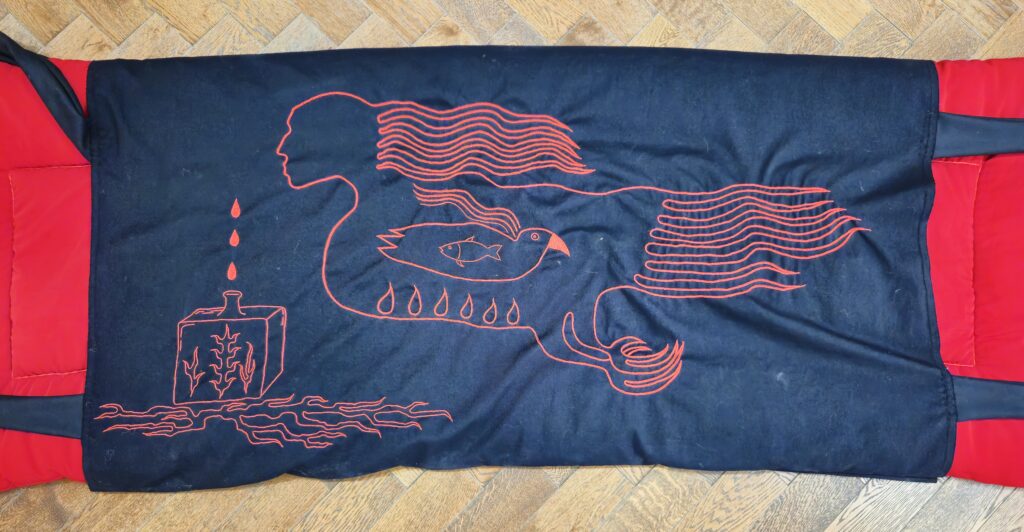 На выставке «Auyspaly küï» у Кунаковой прослеживалось довольно чёткое разделение на мир земной жизни и загробной. Художница работала с многогранными образами казахской культуры и древних кочевых традиций. Герои её полотен и инсталляций существовали в одном из миров, но смыслами были связаны и с другим. Например, одним из центральных образов на её персональной выставке была белая змея — символ, который мы встречаем в новых работах в иных цветах. Змея связана как с реальностью, так и с миром предков.