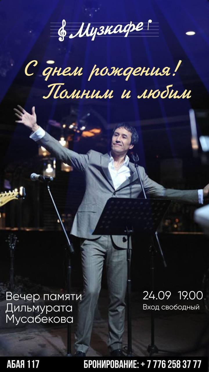 В день рождения композитора, автора и исполнителя Дильмурата Мусабекова, 24 сентября, в «Музкафе» (г. Алматы, пр. Абая, 117) состоится камерный вечер «Белая дорога». Эта дата могла бы стать праздником: в этот день музыканту исполнилось бы 57 лет. Теперь же концерт станет данью уважения человеку, оставившему яркий след в музыкальной культуре Казахстана.