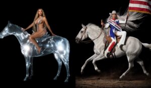 Важно отметить семиотику обложек. Очевидно, что голографический конь из Renaissance символизирует жанр альбома — футуристические звуки техно и хауса в сочетании с диско 80-х и R&B. Конь же из Cowboy Carter вполне реальный, традиционный, более того — липицианской породы. Длинные локоны певицы сливаются с гривой коня, делая их в какой-то момент одним целым. Интересно, что особенностью этих лошадей является то, что рождаются они с тёмным окрасом, а затем со временем светлеют, или вернее — седеют. По этой причине их ошибочно принимают за белых. Намёк на вайтвошинг культуры кантри или недавние обвинения в вайтвошинге самой Бейонсе?