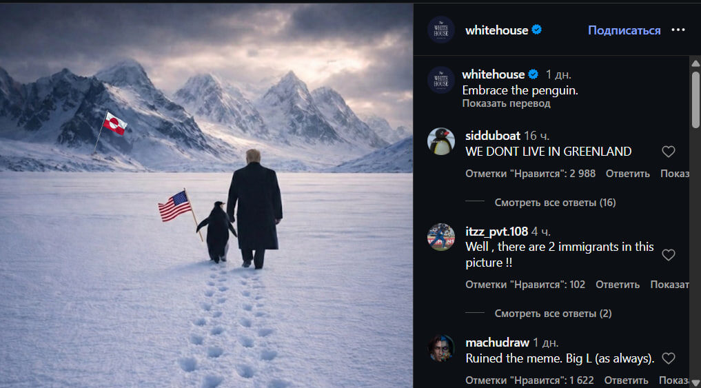 Тренд подхватили и крупные компании. Например, официальный аккаунт VisitAbuDhabi выпустил ролик с пингвином, а Белый дом опубликовал провокационное изображение, на котором пингвин идёт вместе с Дональдом Трампом в Гренландию