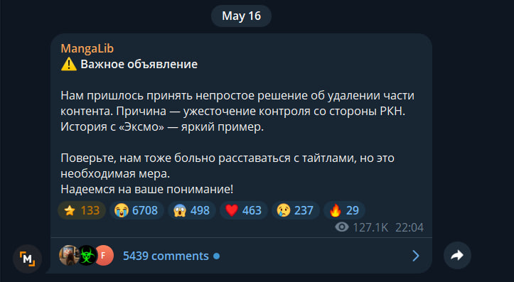Сама платформа не объявляет точный список удалённых произведений. В своём телеграм-канале Mangalib пояснили, что решение связано с арестом директора по дистрибуции издательства «Эксмо» Анатолия Норовяткина. Ему и ещё десяти задержанным грозит до восьми лет тюрьмы за экстремизм.