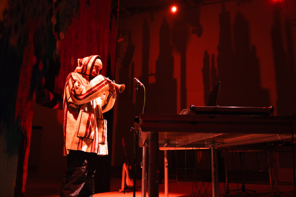 Когда на сцену вышел первый участник, молодой человек в тяжёлой кофте и с духовым инструментом (кажется, это была зурна, распространённая на Ближнем Востоке и Кавказе), мне казалось, что сейчас прозвучит короткая мелодия с пустынными мотивами. Но не прошло и минуты, как к нему добавились тяжёлые электронные ударные, а звук самого инструмента засемплировался и несколько раз исказился, достигнув такой плотности, что покрыл практически всё помещение. Основная тема будущего триеннале, Церемония вечного ветра, касается исследования ветра как основного «ключа к пониманию акустики» — так сказано в его описании от самого «Целинного». Это угадывается уже с первых секунд, потому что каждый перформанс действительно звучал, как ветер, но ветер очень разный.