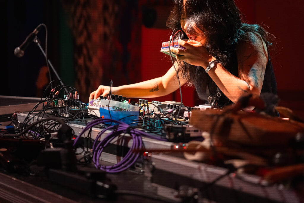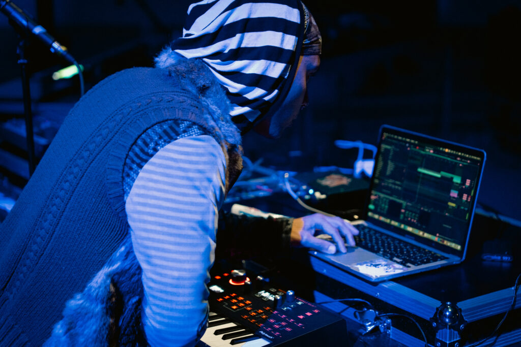 Так уж вышло, что название лаборатории «Ресинтез традиционного» тоже оказалось крайне удачным, потому что передаёт в двух словах ощущение от того, что происходит на сцене. В зале с пугающе высокими потолками, отличной акустикой и приглушённым светом хаотично расположены уютные мягкие места для слушателей. Центральное место занимает сцена — три стола с пультами, множеством проводов, ноутбуками, педалями и всем дополнительным инвентарём, который может потребоваться артистам. За ней — высокий разноцветный подсвеченный стенд, который некоторые участники тоже станут использовать как часть своего перформанса.