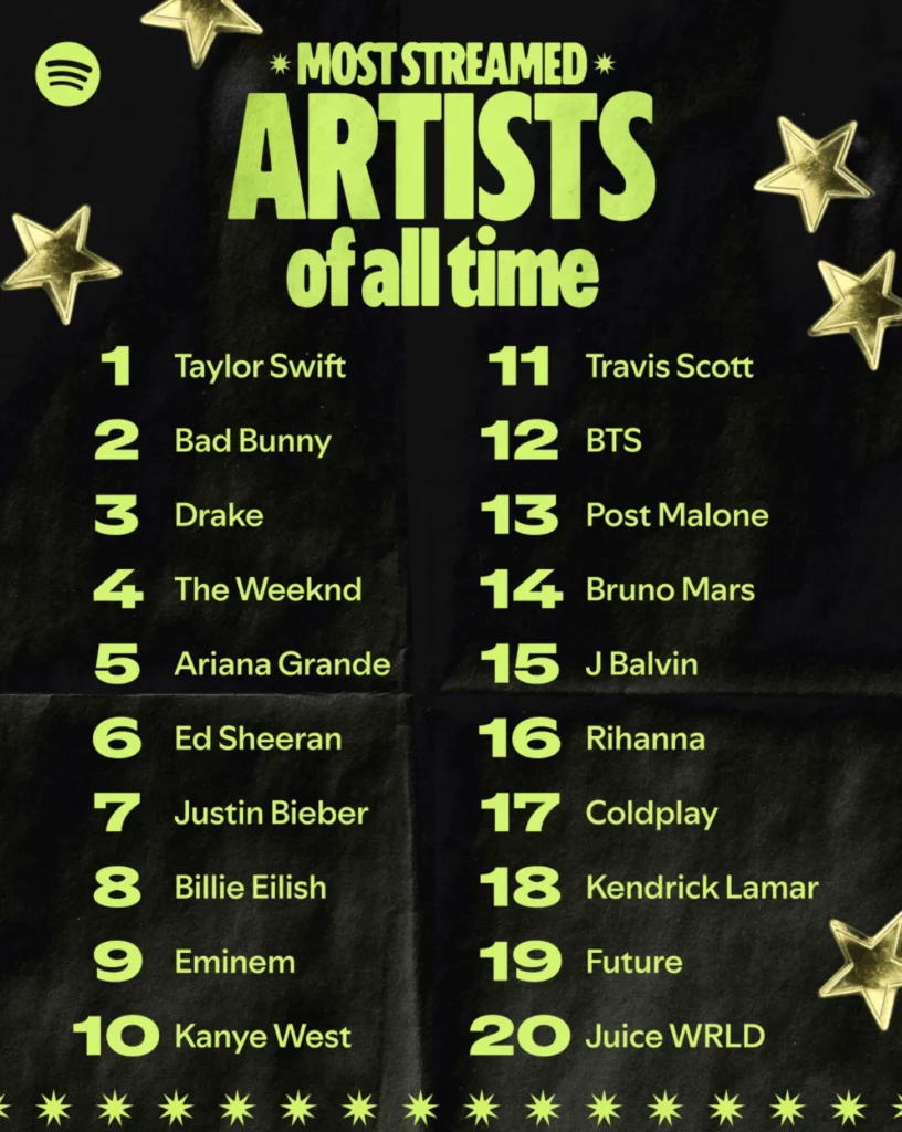 Так, самой прослушиваемой артисткой последних двух десятилетий стала Taylor Swift. Сразу за ней оказались Bad Bunny и Drake.