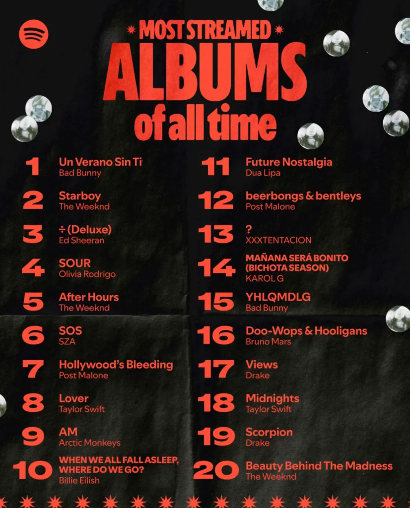 В списке альбомов лидирует «Un Verano Sin Ti» Bad Bunny. В верхней части рейтинга также оказались сразу два альбома The Weeknd — «Starboy» и «After Hours», дебютная пластинка Olivia Rodrigo «Sour» и «SOS» SZA.