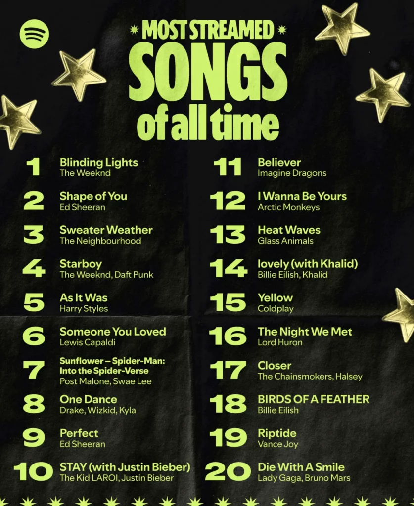 «Blinding Lights» артиста The Weeknd стала самой прослушиваемой песней в истории стриминга. В пятёрке также оказался его трек «Starboy». Далее по списку: «Shape of You», «Sweater Weather» и сингл с последнего альбома Harry Styles «As It Was».
