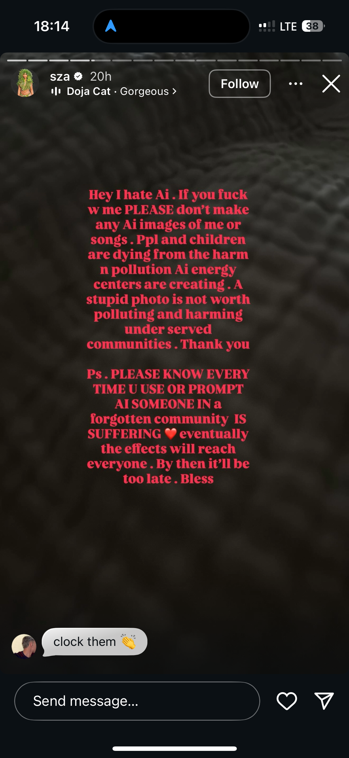 «Эй, я ненавижу AI. Если вы со мной, ПОЖАЛУЙСТА, не делайте никаких AI-картинок со мной и моих песен», — написала SZA. — «Люди и дети умирают от вреда и загрязнения, которые создают энергетические центры для AI. Глупое фото не стоит того, чтобы загрязнять и наносить вред уязвимым сообществам. Спасибо».