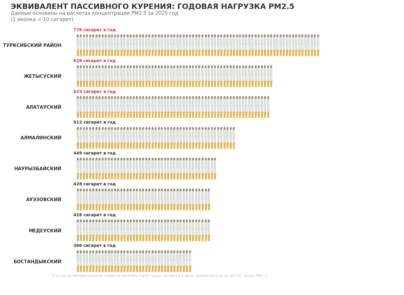 Частный фонд Almaty Air Initiative завершил анализ качества воздуха в Алматы за 2025 год. Согласно данным мониторинга, в прошлом году среднестатистический житель южной столицы невольно «выкурил» 518 сигарет (26 пачек), просто живя в городе. По сравнению с прошлым годом, ситуация не сильно изменилась, а по некоторым параметрам стала только хуже: согласно опубликованным данным, среднегодовая концентрация мелкодисперсных частиц PM2.5 составила 31,2 мкг/м3, что в 6 раз превышает рекомендации ВОЗ. По сравнению с 2024 годом воздух стал грязнее почти на 30%. Всё это связано с неблагоприятными метеорологическими условиями, а также такими внешними факторами, как отопительный сезон. Уже в октябре после включения отопления концентрации PM2.5 резко выросли во всех районах города, особенно в зонах частного сектора.