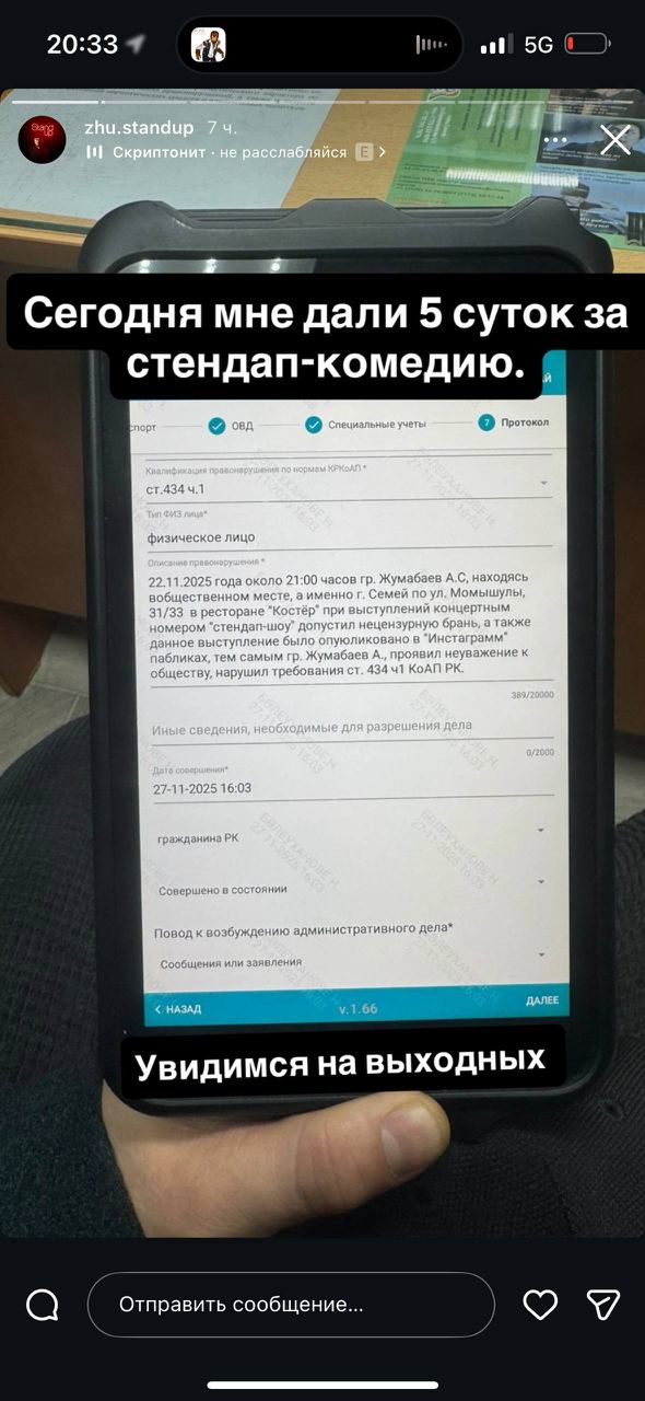 В Семее 1 декабря стендап-комика Алибека Жумабаева из StandUp.ABAY арестовали на пять суток за нецензурную брань.