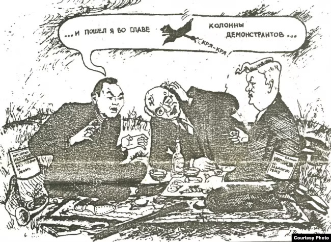 Нұрсұлтан Назарбаев Михаил Горбачёв пен Борис Ельцинге Желтоқсан оқиғасы туралы айтып отыр. Назарбаев оларға: «[86-жылғы көтерілісте] демонстранттар колоннасын… өзім бастап жүрдім!» дейді. Назарбаевтың бұл сөзді айтқаны рас, бірақ мұндай әңгімені өз именетін совет билігіне айтуы мүмкін емес еді.