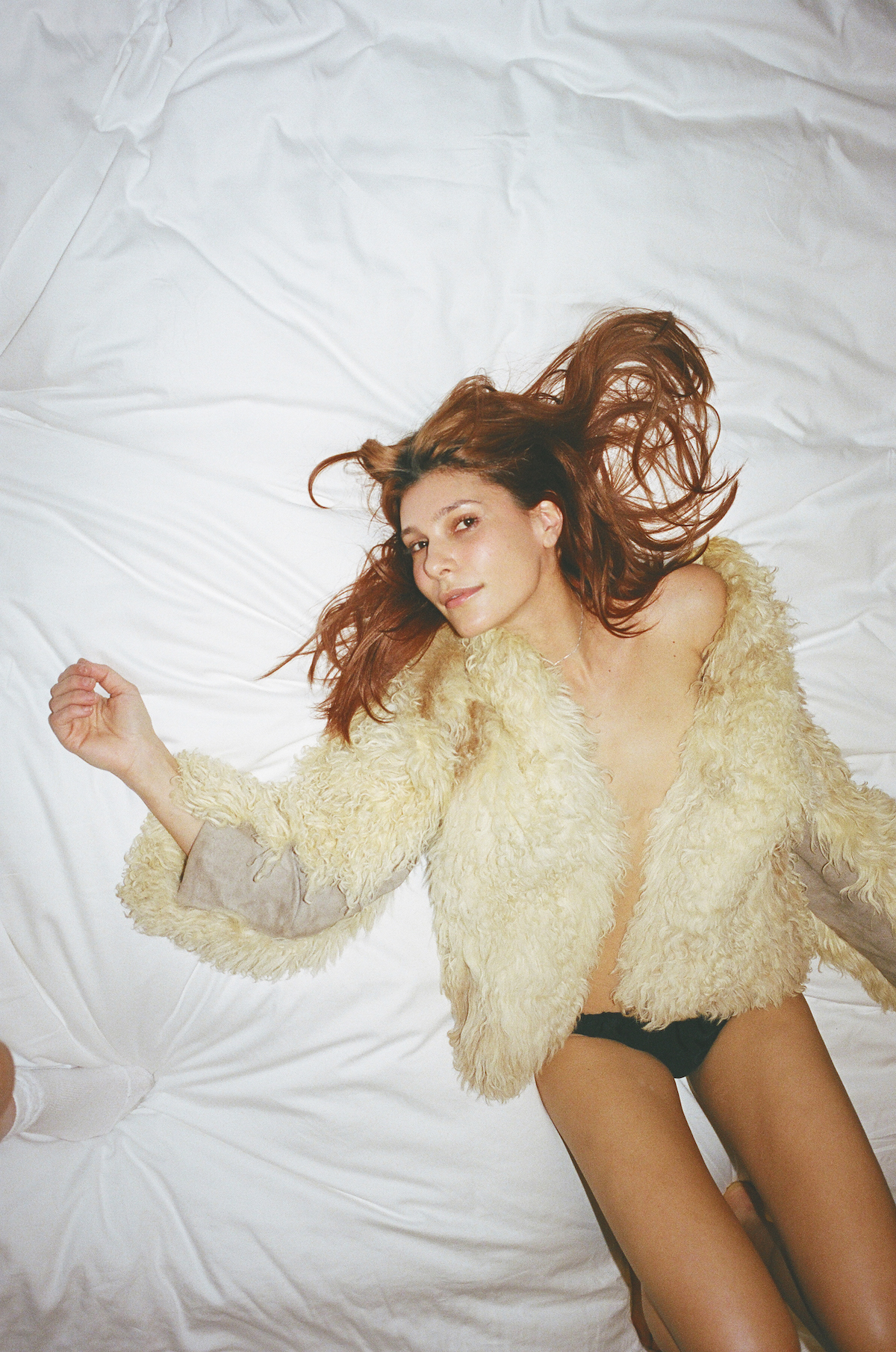 Во-первых, это кинематографическая работа со светом. Модели часто позируют на фоне белой стены и светлого постельного белья, и изображения приобретают мягкое, приторное качество. Фотографка оперирует не студийными вспышками, а случайным рассеянным светом, проникающим через окно. Этот свет не просто освещает, он скульптурно выделяет текстуру кожи, нюансы теней, тела и даже микровыражения лица. Он придаёт кадрам ощутимую поэтическую уязвимость и глубину, создавая эффект, будто зритель — единственный свидетель этого подлинного момента.