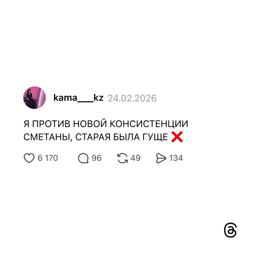Перед референдумом проекта новой Конституции, премьер-министр Казахстана Олжас Бектенов поручил МВД «жёстко» реагировать на распространение фейков и публикаций о проекте новой Конституции. А после этого в казахстанском сегменте Threads появились ветки с упоминанием «консистенции сметаны». В одном из популярных обсуждений автор пишет: «Я против новой консистенции сметаны, старая была гуще». В комментариях идею поддержали сравнением с другими странами, где «консистенцию никогда не меняют и люди довольны». А позже про сметану забыли, и обсуждение перешло на «новую конструкцию несущей стены». Пользователи шутили, что старая планировка надежнее и от неё «не ехала крыша».