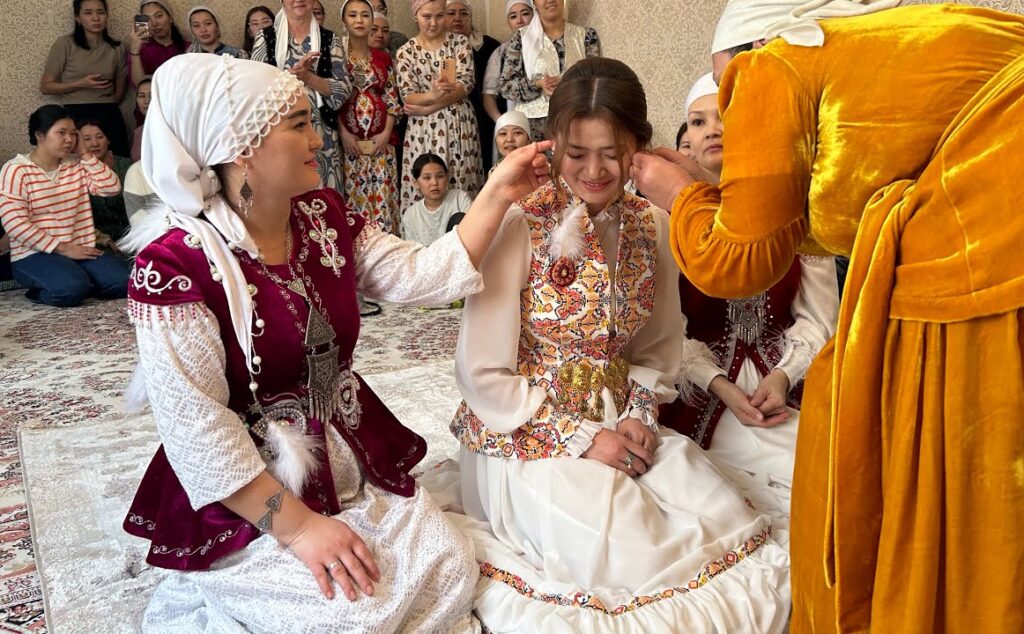 Во время сватовства — құда түсу — девушке традиционно надевают золотые серьги. До Октябрьской революции серьги в ушах засватанной девушки означали, что сваты уже приходили и получили согласие, ведь калым выплачивался частями в течение года (а иногда и дольше), и девушку выдавали из родительского дома только после внесения последней части. Сегодня ритуал сохранился, но носит скорее символический характер — знак уважения и признания серьёзности намерений.