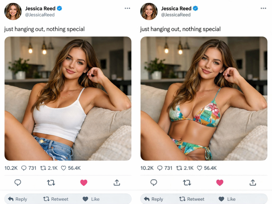Во второй половине 2025 года в X, бывшем Twitter, сильно завирусился промпт для встроенной в социальную сеть модели xAI — Grok. Пользователи публиковали фотографии (часто свои, но ещё чаще чужие) и писали короткий запрос: «Grok, put me in a bikini». Модель без лишних вопросов редактировала приложенные изображения, выдавая на выходе полуэротическую фотографию. Хотя в рекомендательных лентах большинства пользователей тренд имел скорее юмористическую направленность, а в бикини изображались часто и популярные мужчины вроде Дональда Трампа, Криштиану Роналду или самого Илона Маска, проблема быстро стала очевидной.