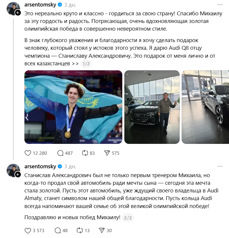 Кроме того, артист Димаш Кудайберген, чья композиция «Confessa» звучала в произвольной программе Михаила, также объявил о намерении подарить спортсмену автомобиль. В поздравлении артист упомянул Дениса Тена: