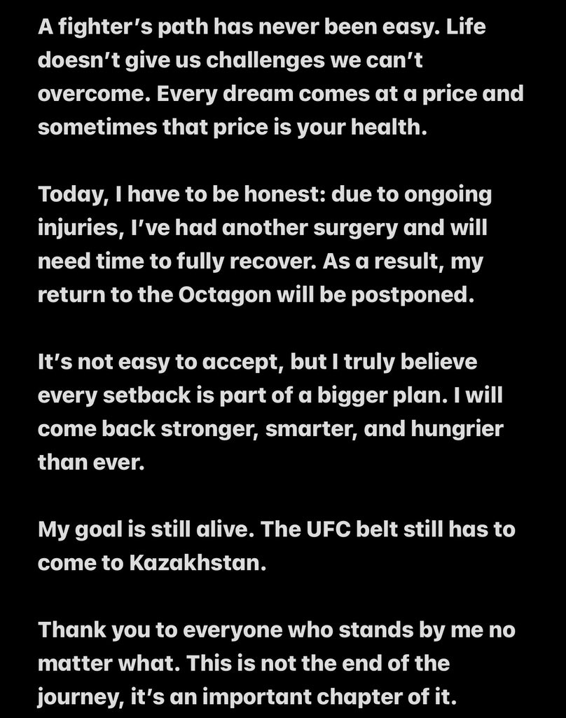 Путь бойца никогда не был легким, но жизнь не ставит перед нами задач, которые мы не можем преодолеть. Каждая мечта имеет свою цену, и иногда этой ценой является ваше здоровье. Сегодня я должен быть честен: из-за продолжающихся травм мне пришлось перенести еще одну операцию, и мне понадобится время, чтобы полностью восстановиться. В результате мое возвращение в октагон будет отложено. Это нелегко принять, но я искренне верю, что это часть большого плана. Я вернусь сильнее, умнее и голоднее, чем когда-либо. Моя цель по-прежнему актуальна. Пояс UFC все еще должен приехать в Казахстан. Спасибо всем, кто поддерживает меня несмотря ни на что. Это не конец пути, а важная его глава», — передаёт UFC Eurasia.
