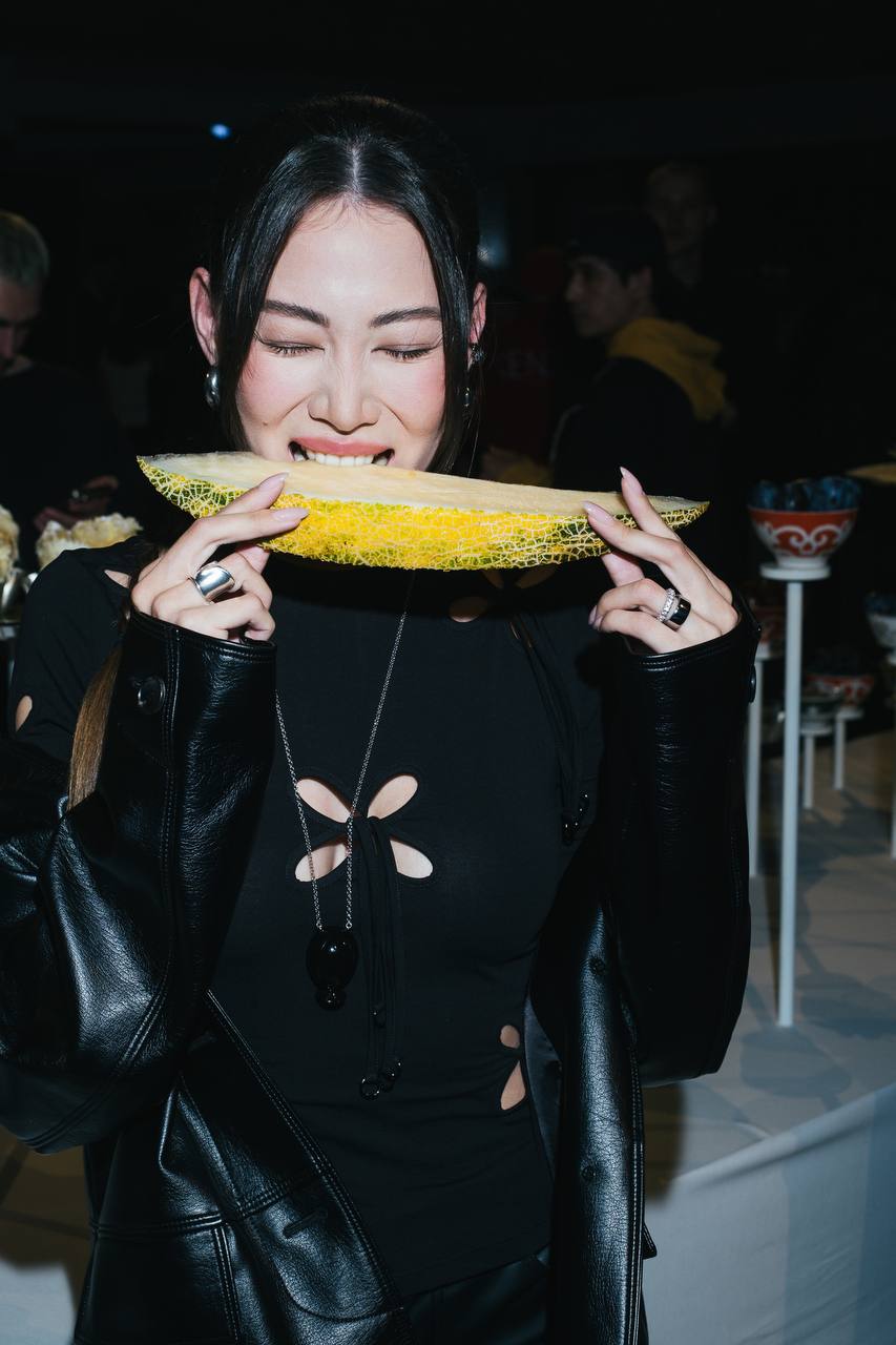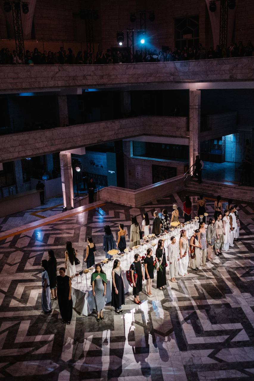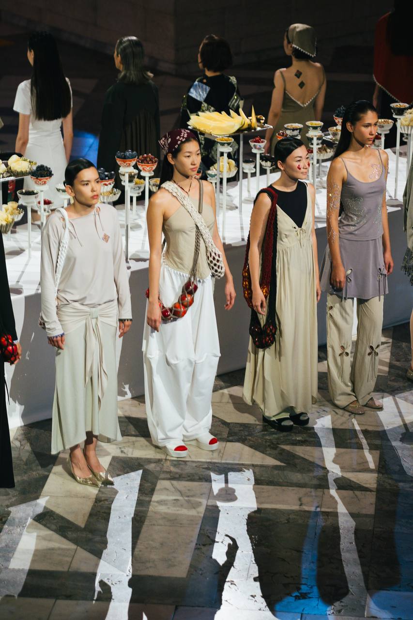 Сет-дизайн построили вокруг семиметрового стола, превращённого в художественную инсталляцию. Он стал метафорой дома — места, где рождается чувство уюта и защищённости. Модели взаимодействовали с пространством, воплощая образы героинь коллекции. Гостей же угощали закусками и напитками, вдохновлёнными центрально-азиатской кухней, но переосмысленными в современном ключе.