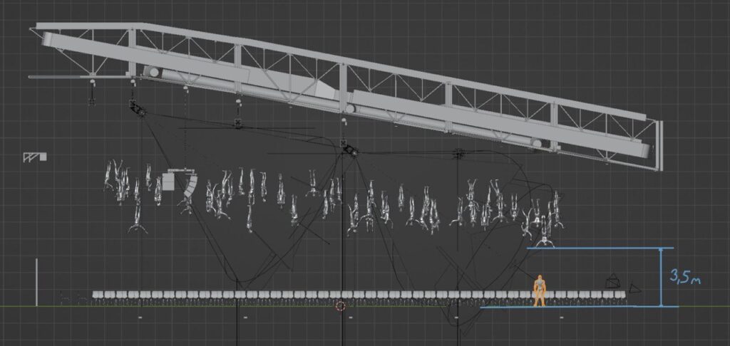 Реализация этой идеи стала техническим вызовом. Работа с отражением требовала сложных пространственных решений, точной хореографии и продуманного света. Проект создавался в сжатые сроки, многие элементы разрабатывались буквально за две недели до показа.