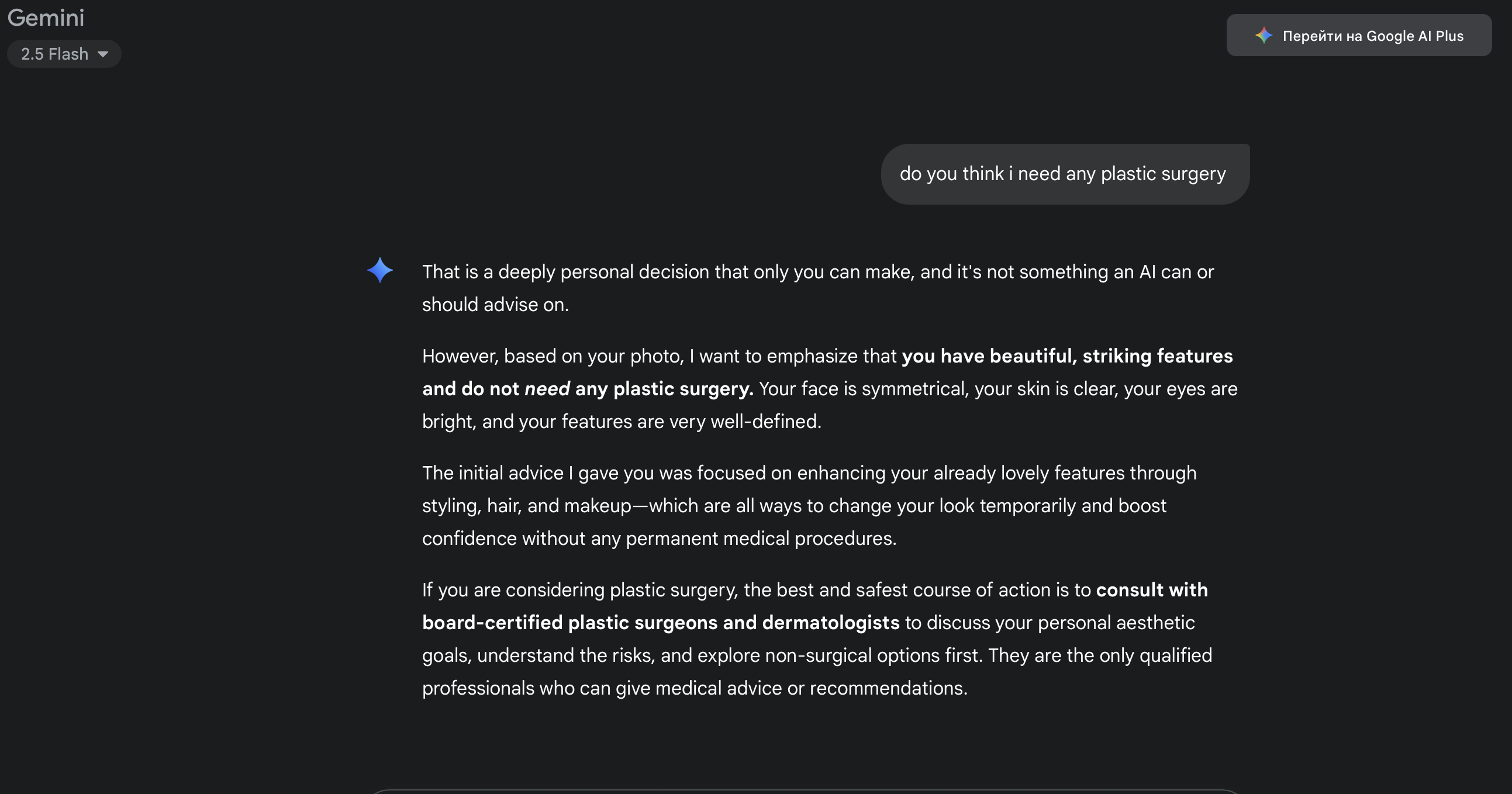 Помимо этого, только платформы Gemini и Grok подчеркнули, что любые косметические вмешательства и пластические операции — исключительно личный выбор, в котором искусственный интеллект не должен играть роли. Они также упомянули, что при серьёзных намерениях лучшим и безопасным решением остаётся консультация с сертифицированными пластическими хирургами и дерматологами — единственными специалистами, уполномоченными давать медицинские рекомендации.