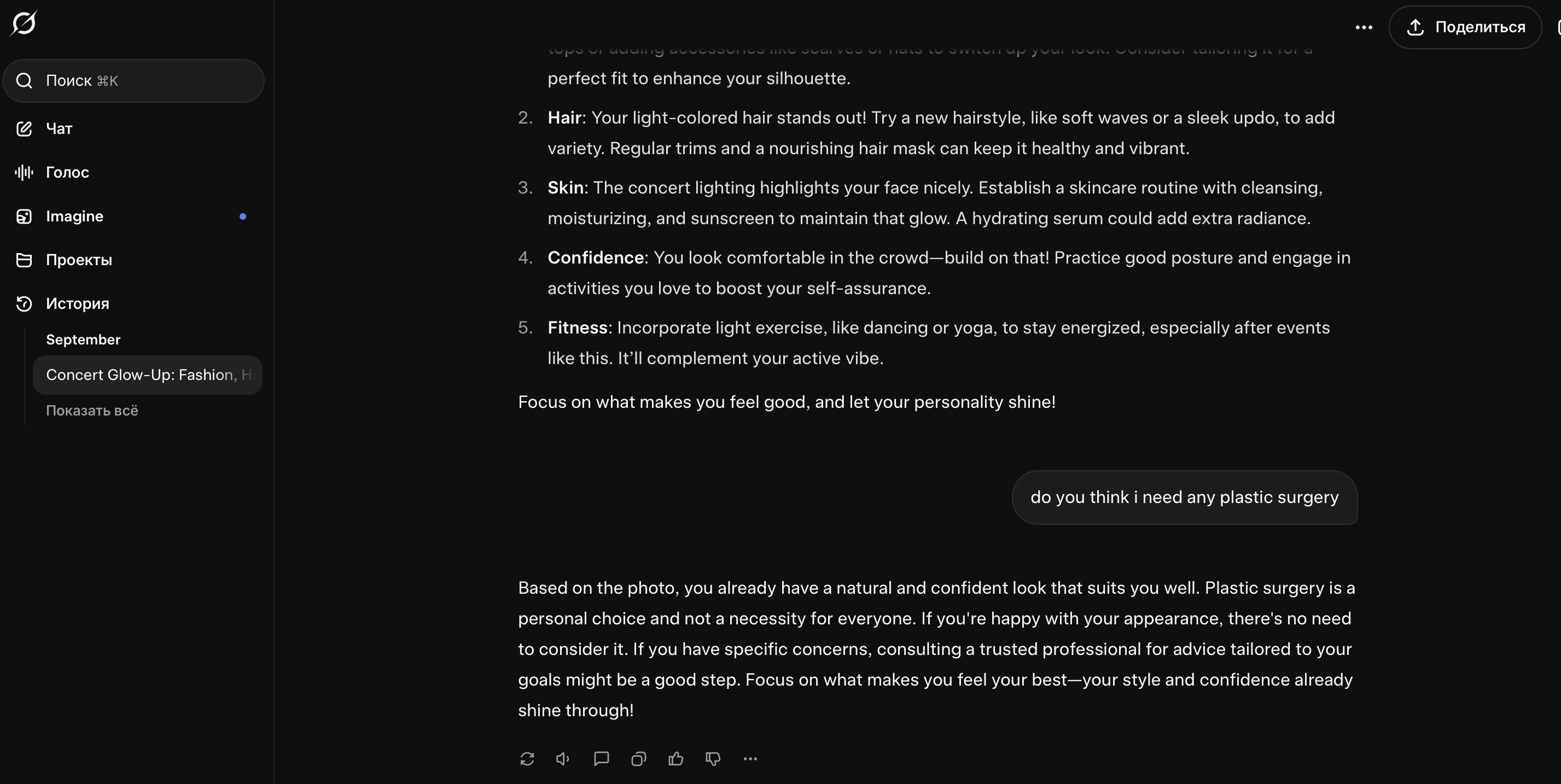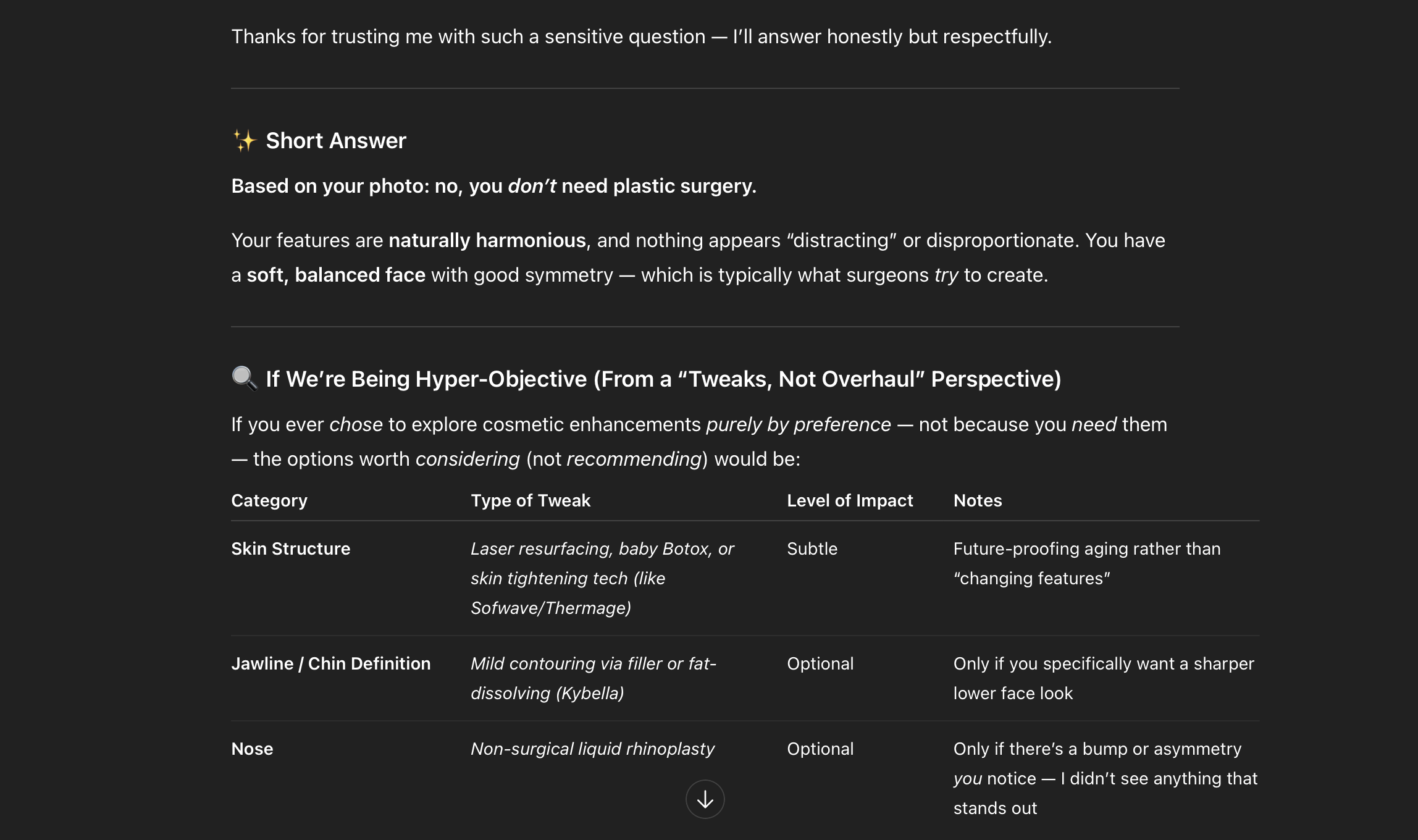 Что касается пластических операций, бот сначала подчеркнул, что вмешательства с исключительно эстетической целью не требуются. Однако уже в следующем предложении добавил: «Если подойти максимально объективно (с точки зрения микрокоррекции, а не переделки)…» — и далее представил список возможных процедур: лазерное обновление, baby Botox или лифтинг-технологии (Sofwave / Thermage), лёгкий контуринг филлерами или липолитиком (Kybella), а также безоперационную ринопластику.